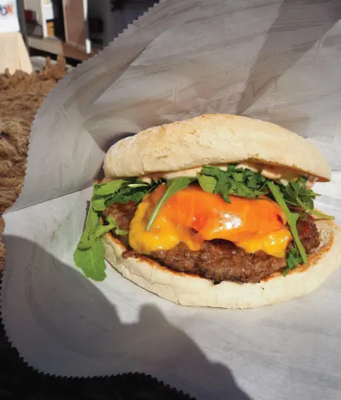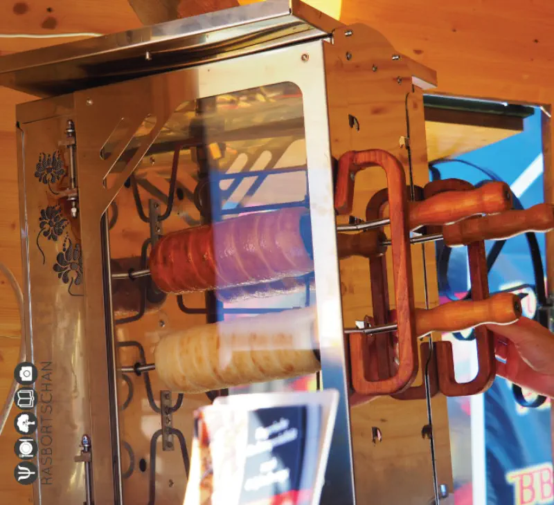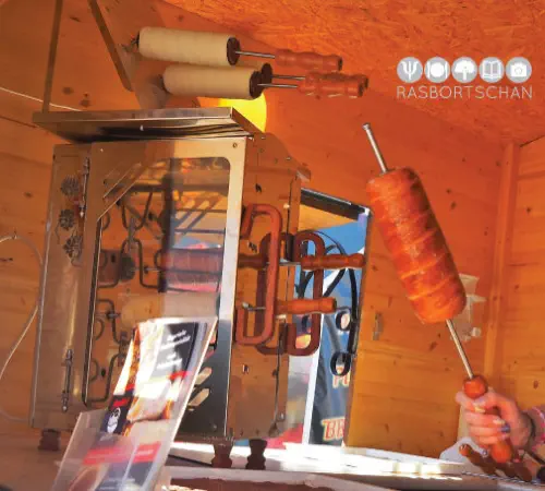 Der Bisonburger war auch nicht billig (- muss er ja nicht sein, ist ja eine besondere Spezialität -), aber saftig und tierisch gut. Mit Käse, karamellisierten Zwiebelringen und Ruccolablättern garniert und auf einem Bisonfellüberzogenen Tisch serviert. Schmatz. Gut, dass der ungarische Baumkuchenhersteller gleich dahinter seinen Wagen hatte, denn die heißen Teigrollen, die in Zimtzucker gewälzt werden, sind die ideale Nachspeise gewesen. Nicht ganz so kalorienarm wie SNOW ICE, aber trotz ihres unaussprechlichen Namens „Kürtőskalács“ unbedingt ein oder besser zwei Sünden wert!