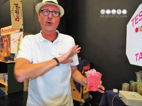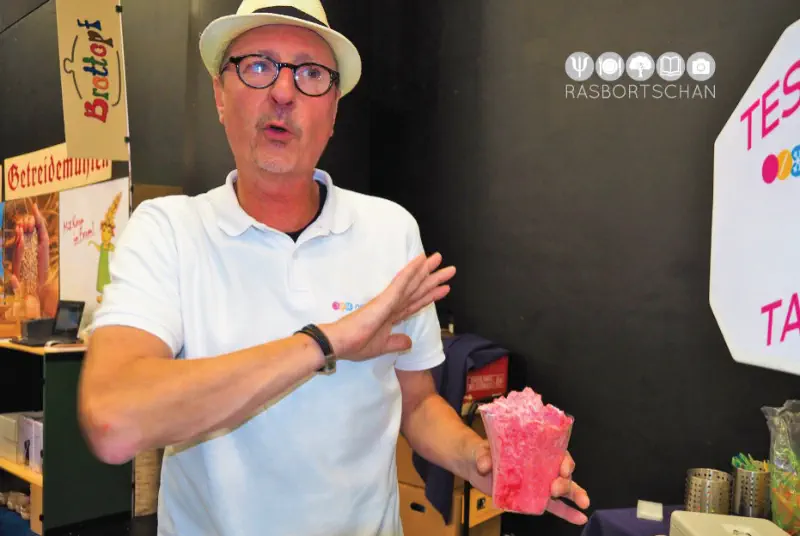 Eine ganz neue Welt eröffnete sich in den anderen Hallen und am Freiplatz, wo die herbstlich warme Sonne ihr Bestes gab. Wer kalorienarmes und gesundes Eis naschen möchte, ist bei NEW SNOW ICE“ genau richtig, denn die „fluffige“ Eis- Innovation besteht aus frisch zubereiteten zarten Obstmarkeisflocken, wenig Zucker und kann auch lactosefrei und vegan hergestellt werden. Das speziell entwickelte Zerkleinerungsverfahren zaubert ein Schneeeis, das luftig leicht auf der Zunge schmilzt und dabei seinen unvergleichbar natürlichen und intensiven Geschmack entfaltet. Sehr fein, sehr g´schmackig, sehr teuer.